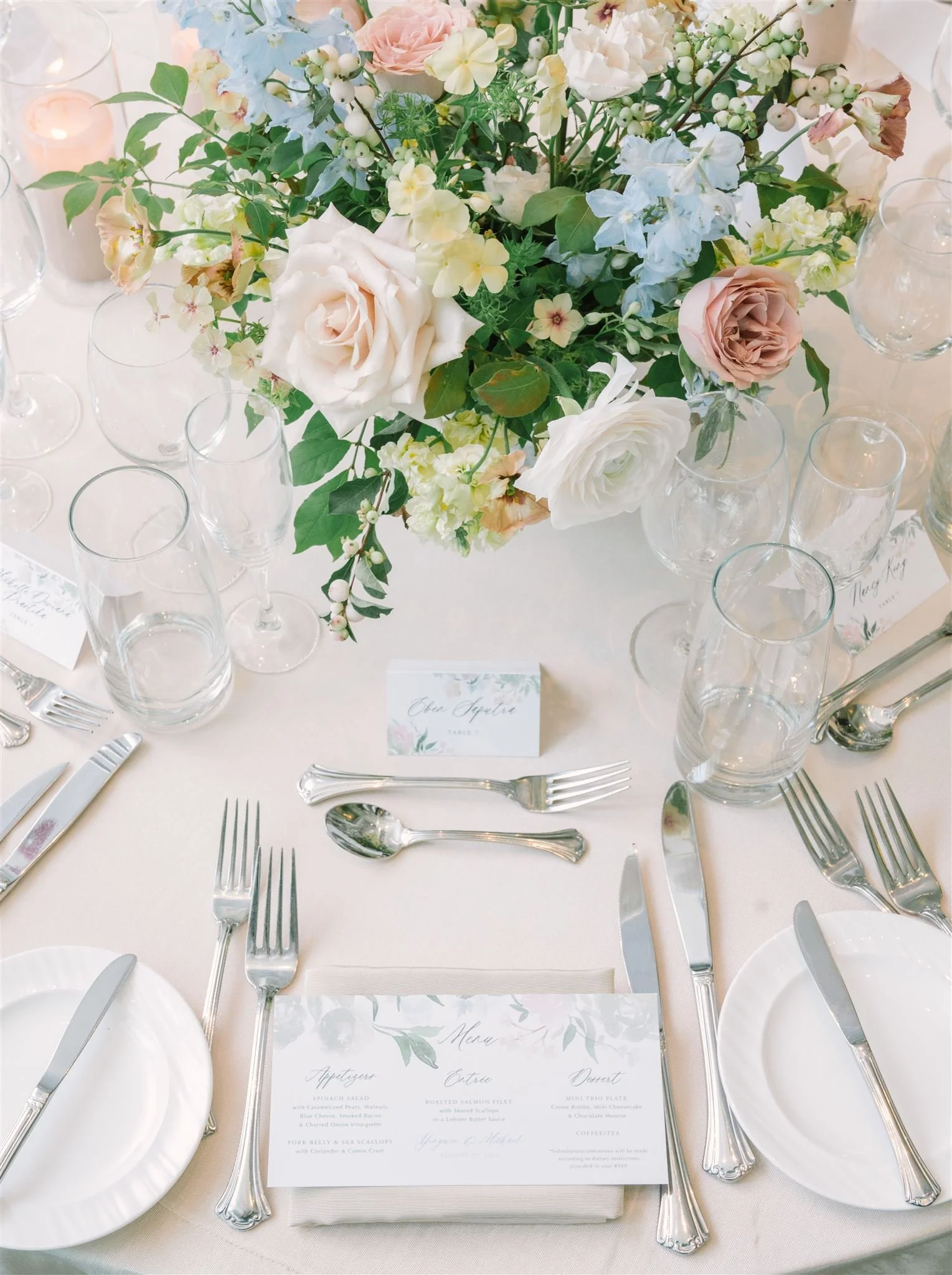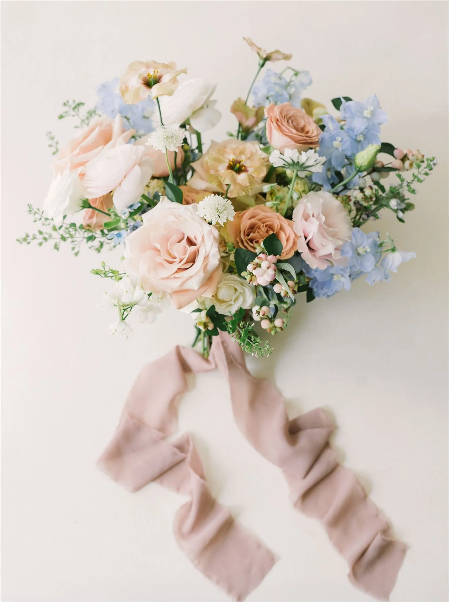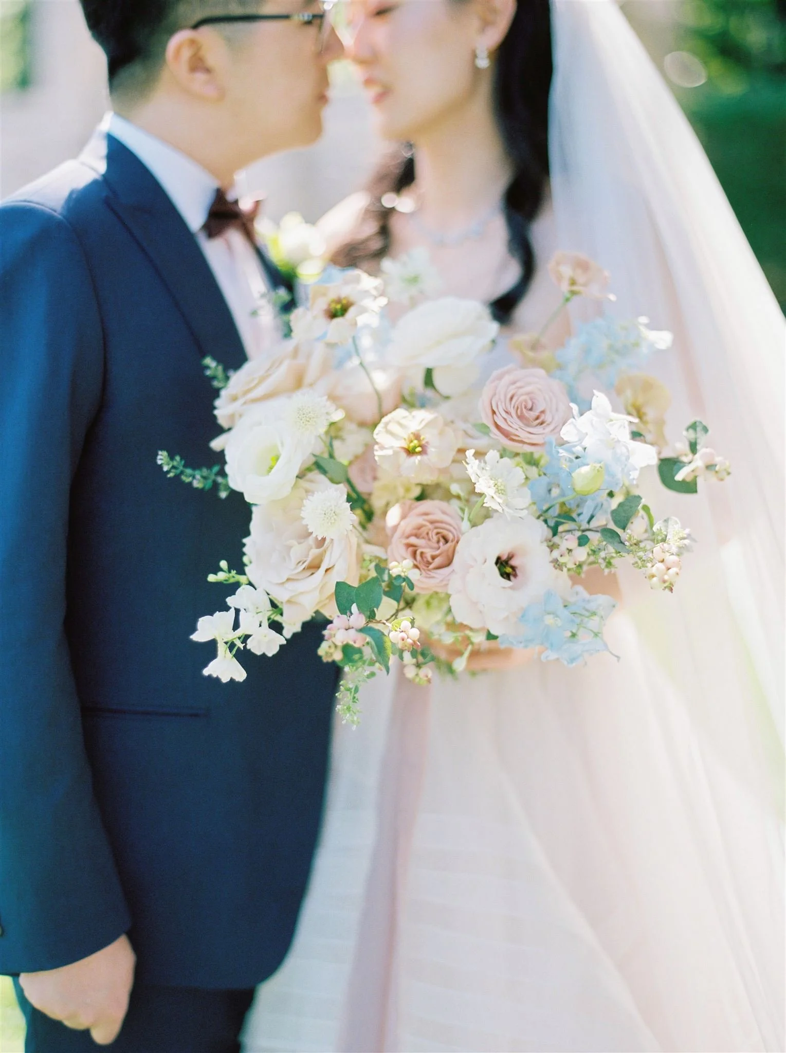 Yingwei and Michael's wedding at The Guild Inn Estate was a vision of garden-inspired elegance. Their floral arrangements featured a romantic palette of blush pinks and soft blues, incorporating delicate blooms such as roses, delphiniums, and soft brown lisianthus. The bouquets and centerpieces were complemented by lush greenery, creating a harmonious blend that echoed the natural beauty at The Guild Inn Estate.